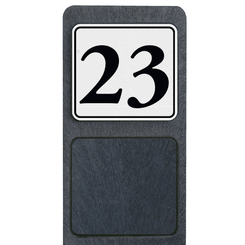 Verzwaarde huisnummerpaal van gerecycled kunststof, voorzien van 2 uitsparingen aan twee zijden voor plaatsing van o.a. huisnummerbordjes.