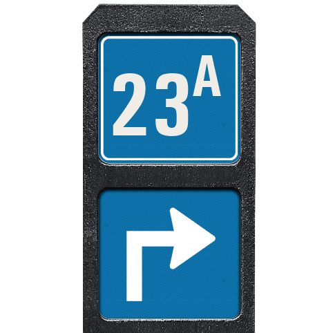 Bermpaal 1250x150x40mm met twee reflecterende bordjes 119x109mm met print van tekst / pictogrammen in reflectieklasse 3 (incl. anti-graffiti laminaat).